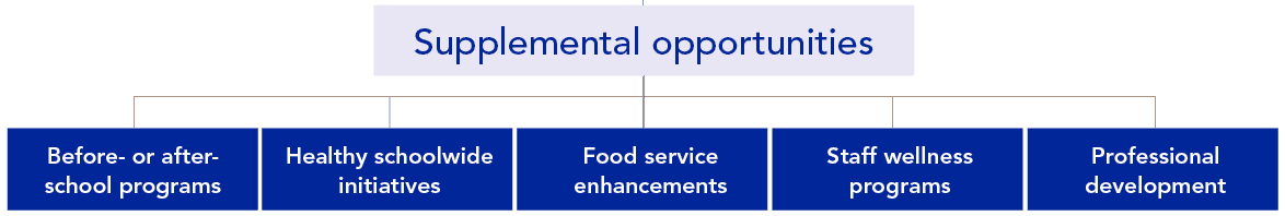 The supplemental opportunities include enhancing current or launching new before- or after-school wellness programs, guidance for school meals and food service, implementing healthy schoolwide initiatives, promoting staff wellness, and accessing customized professional development. Each supplemental component is designed to provide new programming schools with targeted assistance, helpful resources, and in some cases, access to directed funding.